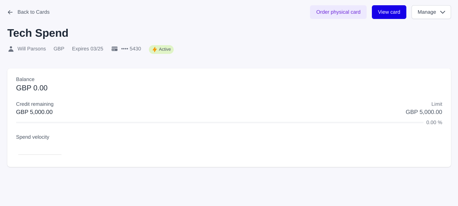 Simply log in to the platform and go into the Cards section -> click on your card -> then select Order physical card at the top of the screen (shown in light purple below). From here you can choose whether to order your card to your company address or an alternative address.