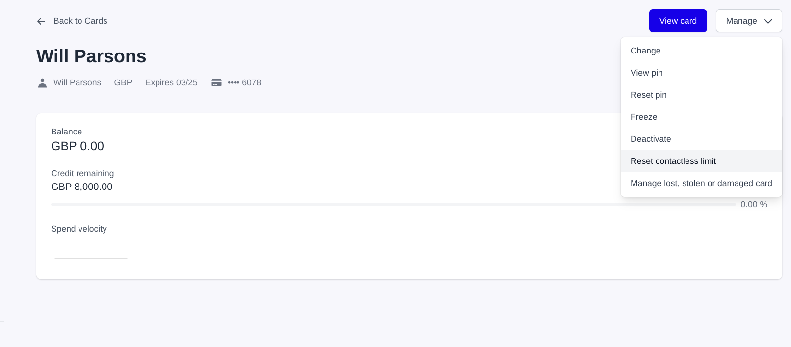 Log into the platform -> Click on the Cards feature and click into your card -> Click Manage in the top right of the screen -> Reset contactless limit.